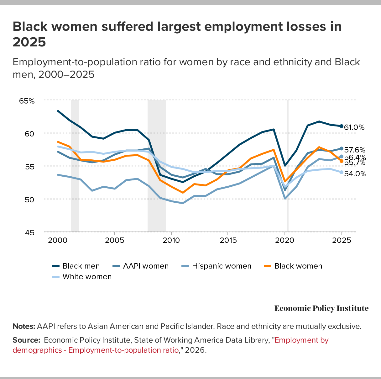 Source: Economic Policy Institute, State of Working America Data Library, "Employment by demographics - Employment-to-population ratio," 2026.