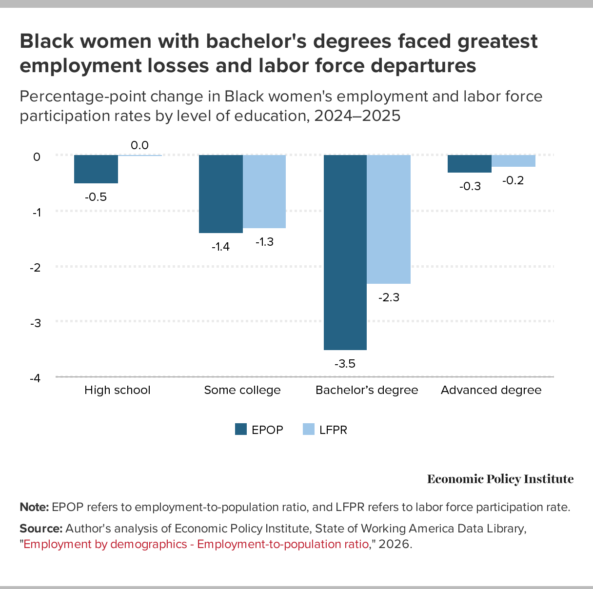 Black women with bachelor's degrees faced greatest employment losses and labor force departures: Percentage-point change in Black women's employment and labor force participation rates by level of education, 2024–2025
