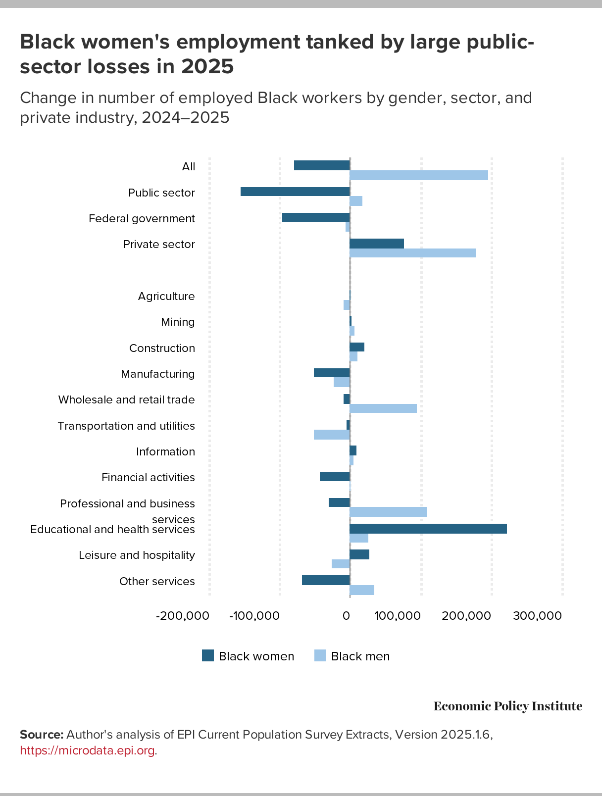 Black women's employment tanked by large public-sector losses in 2025: Change in number of employed Black workers by gender, sector, and private industry, 2024–2025
