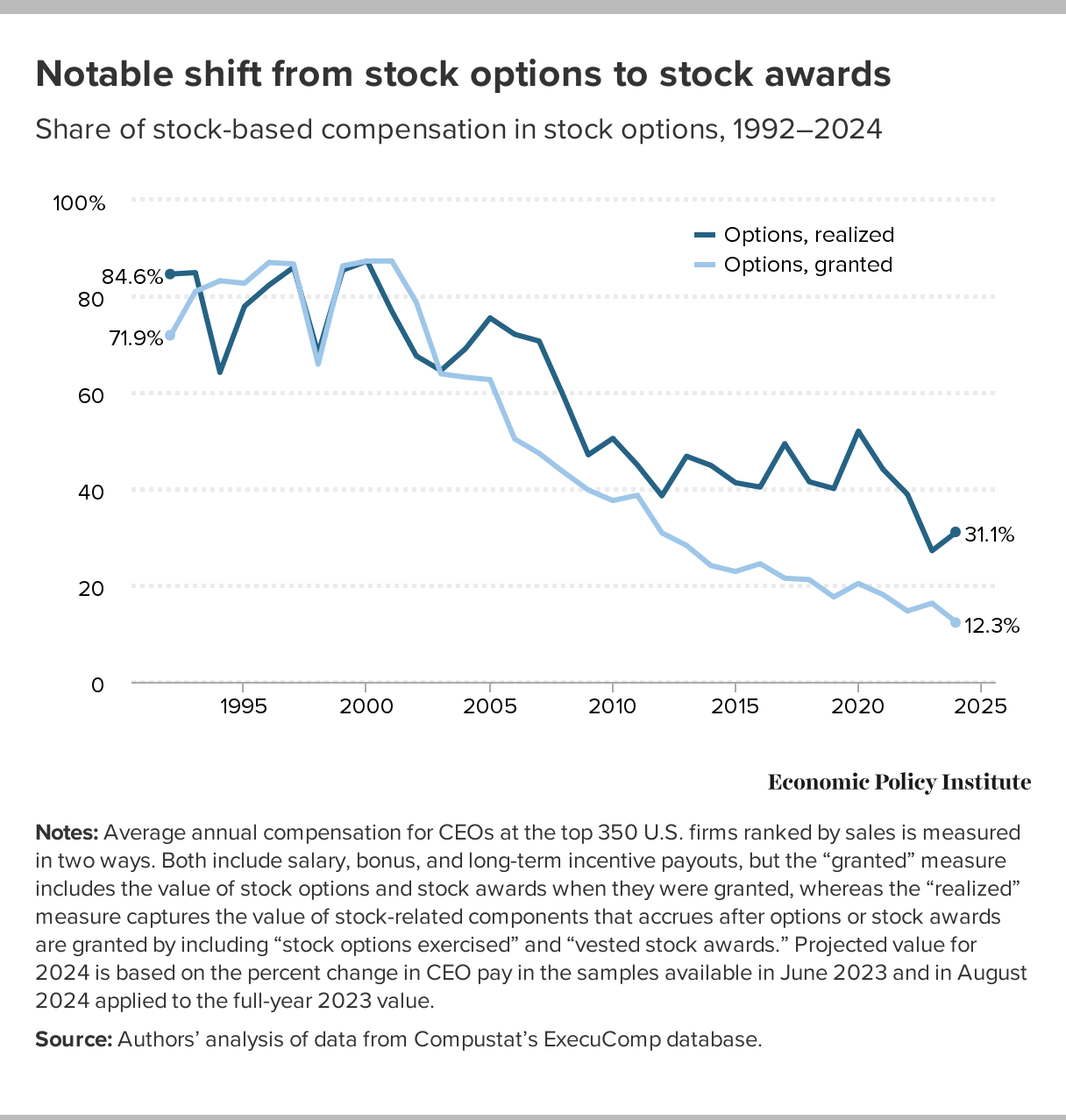Notable shift from stock options to stock awards: Share of stock-based compensation in stock options, 1992–2024