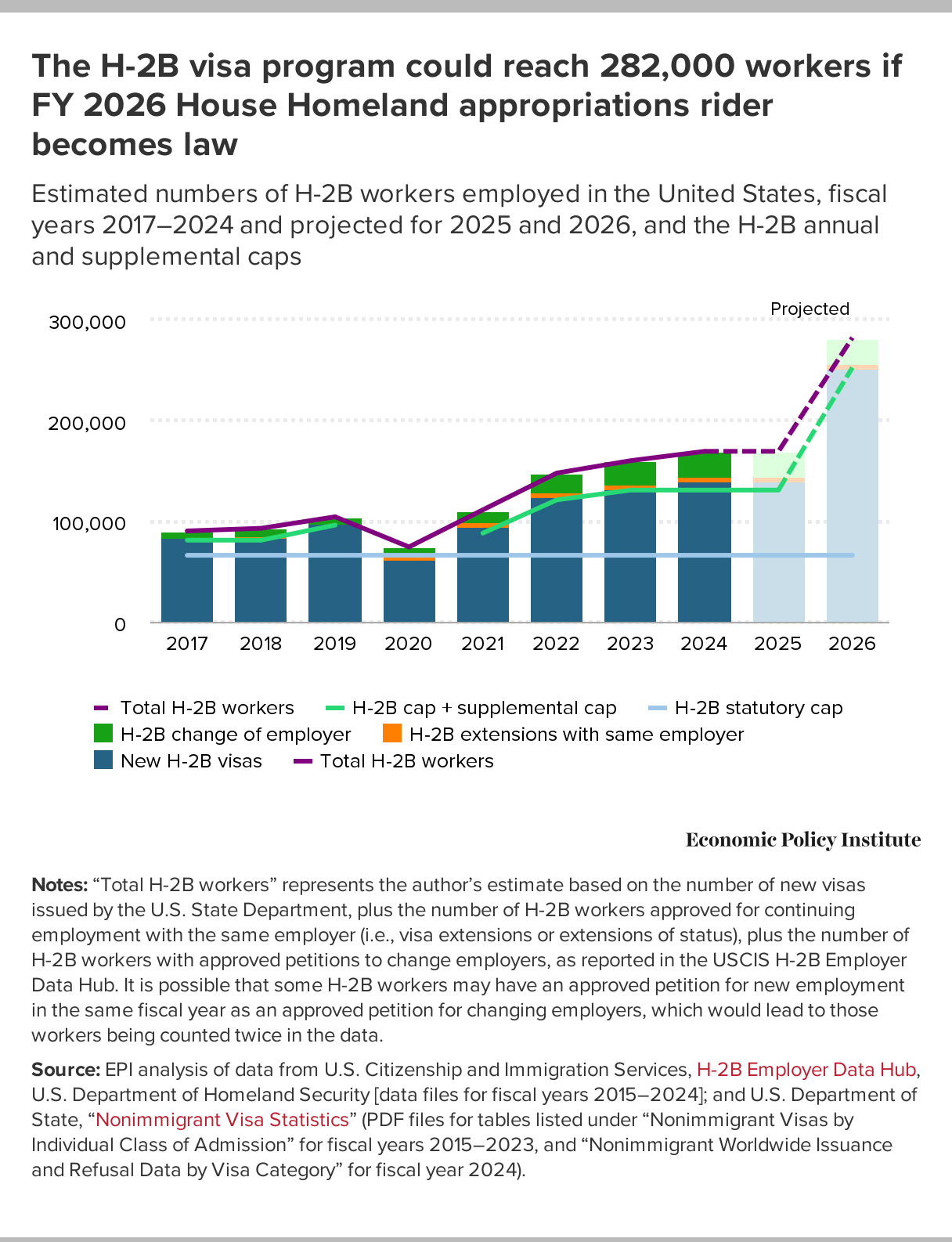 The H-2B visa program could reach 282,000 workers if FY 2026 House Homeland appropriations rider becomes law: Estimated numbers of H-2B workers employed in the United States, fiscal years 2017–2024 and projected for 2025 and 2026, and the H-2B annual and supplemental caps