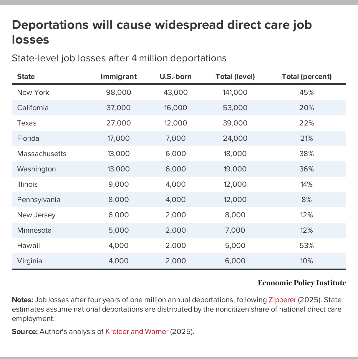 Notes: Job losses after four years of one million annual deportations, following Zipperer (2025). State estimates assume national deportations are distributed by the noncitizen share of national direct care employment.