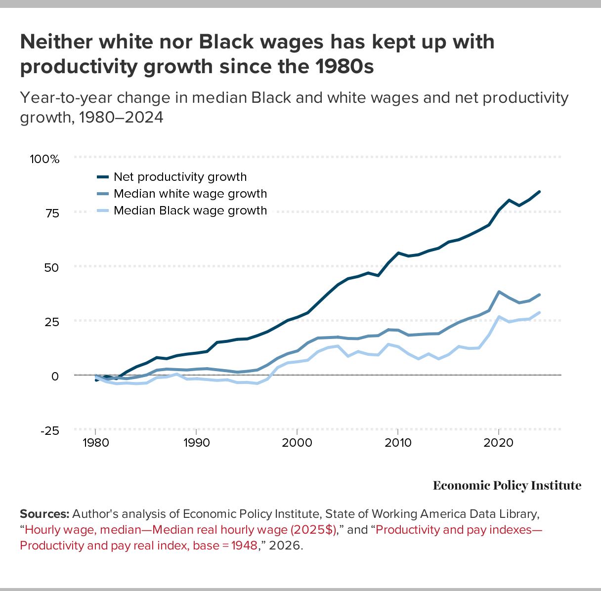 Sources: Author's analysis of Economic Policy Institute, State of Working America Data Library, “Black-white wage gap—Black-white wage gap, raw median,” and “Productivity and pay levels—Productivity and pay, real dollars per hour (2024$),” 2026.
