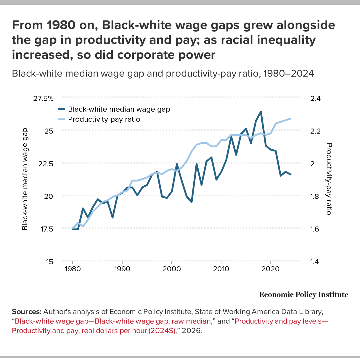 From 1980 on, Black-white wage gaps grew alongside the gap in productivity and pay; as racial inequality increased, so did corporate power: Black-white median wage gap and productivity-pay ratio, 1980–2024