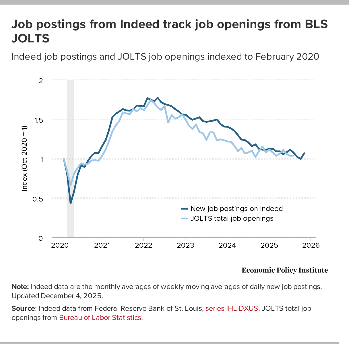 In normal times, today would have been a jobs day. However, the Bureau of Labor Statistics (BLS) has been forced to delay the release until December 16 due to the lingering impacts of the Trump administration radically restricting BLS operations during the government shutdown. Further, BLS has announced that we will never have data from the monthly survey of households for October. This means that valuable information for that month—like the overall unemployment rate or the unemployment rate for various demographic groups—will never be known. During the last federal shutdown in 2018–2019, BLS did not suspend its activities and released its employment situation report as normal. In fact, this is the first time in 12 years that a jobs report was delayed and the first time a month of household data will be missed completely.