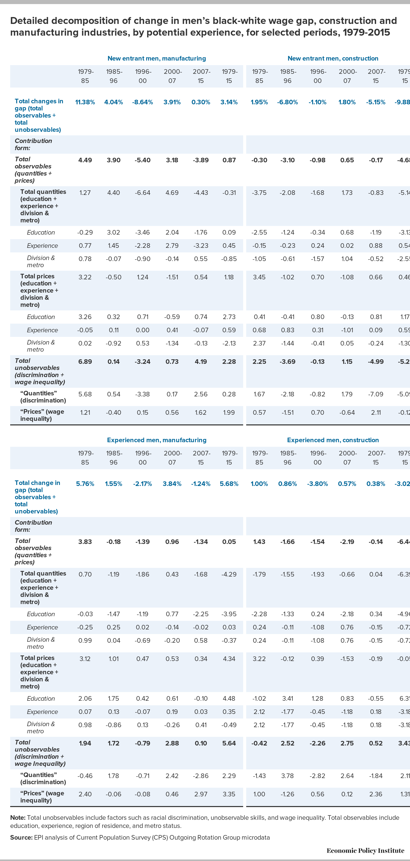 Detailed decomposition of change in men’s black-white wage gap, construction and manufacturing industries, by potential experience, for selected periods, 1979-2015