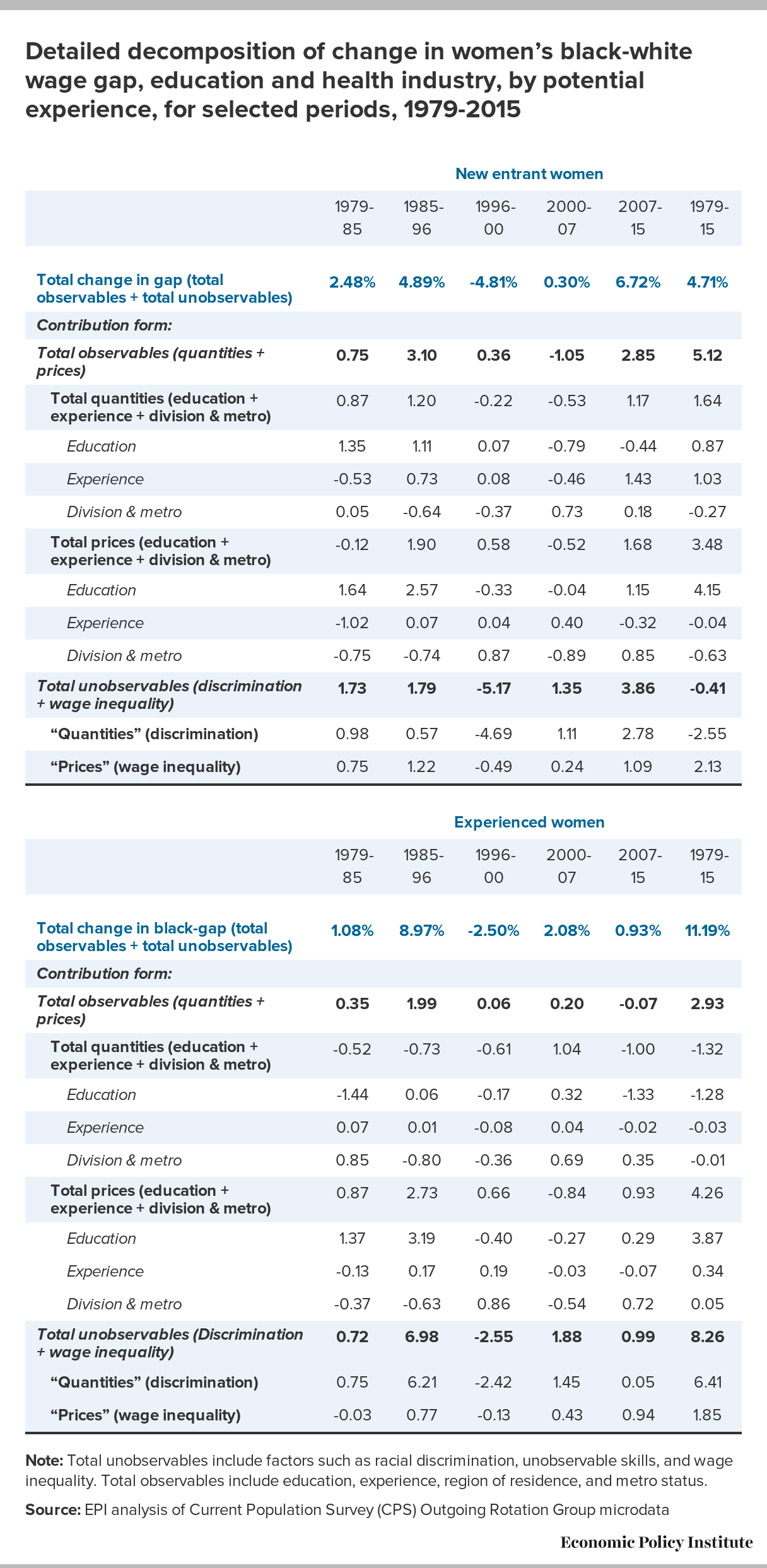 Detailed decomposition of change in women’s black-white wage gap, education and health industry, by potential experience, for selected periods, 1979-2015