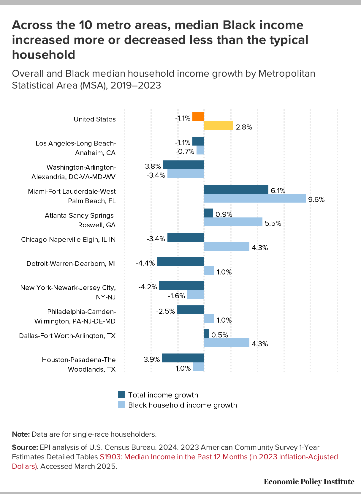 Across the 10 metro areas, median Black income increased more or decreased less than the typical household: Overall and Black median household income growth by Metropolitan Statistical Area (MSA), 2019–2023