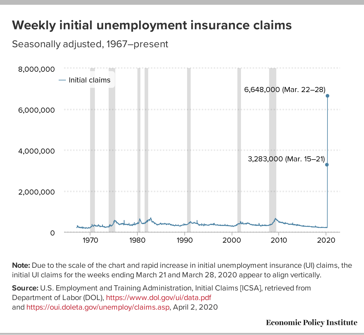 Source: U.S. Employment and Training Administration, Initial Claims [ICSA], retrieved from Department of Labor (DOL), https://www.dol.gov/ui/data.pdf and https://oui.doleta.gov/unemploy/claims.asp, April 2, 2020