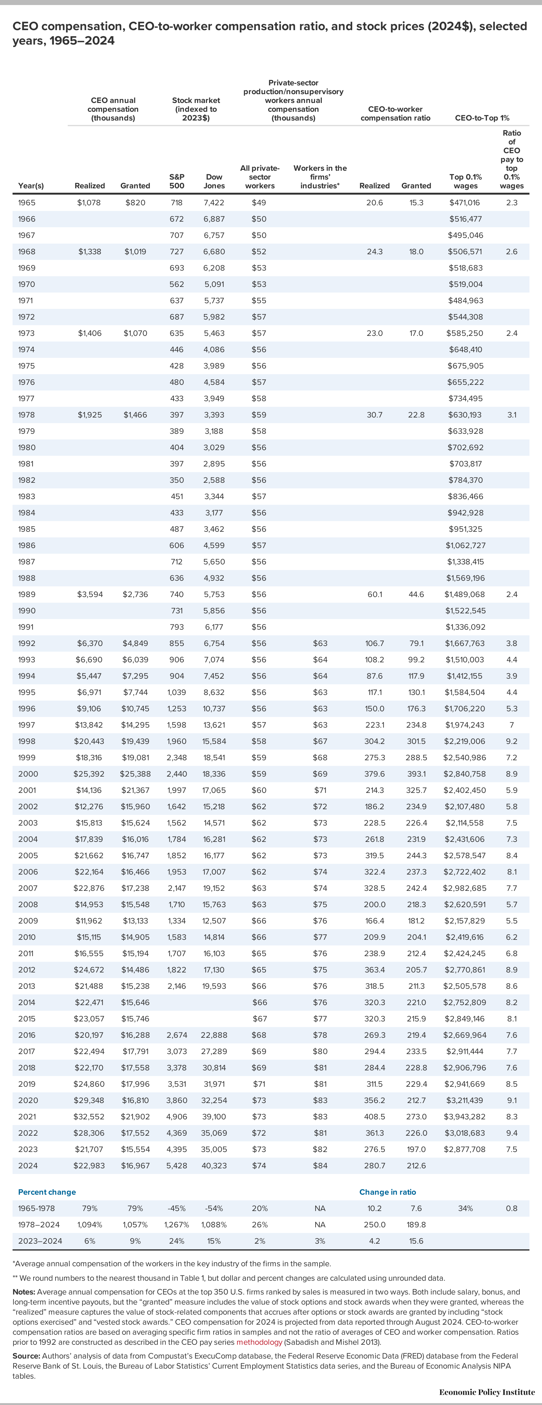 Next chart: CEO compensation, CEO-to-worker compensation ratio, and stock prices (2024$), selected years, 1965–2024 »