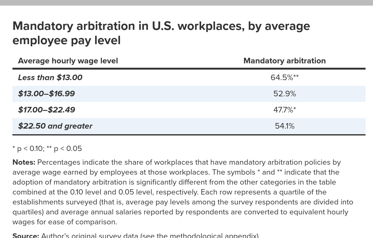 Notes: Percentages indicate the share of workplaces that have mandatory arbitration policies by average wage earned by employees at those workplaces. The symbols * and ** indicate that the adoption of mandatory arbitration is significantly different from the other categories in the table combined at the 0.10 level and 0.05 level, respectively. Each row represents a quartile of the establishments surveyed (that is, average pay levels among the survey respondents are divided into quartiles) and average annual salaries reported by respondents are converted to equivalent hourly wages for ease of comparison.