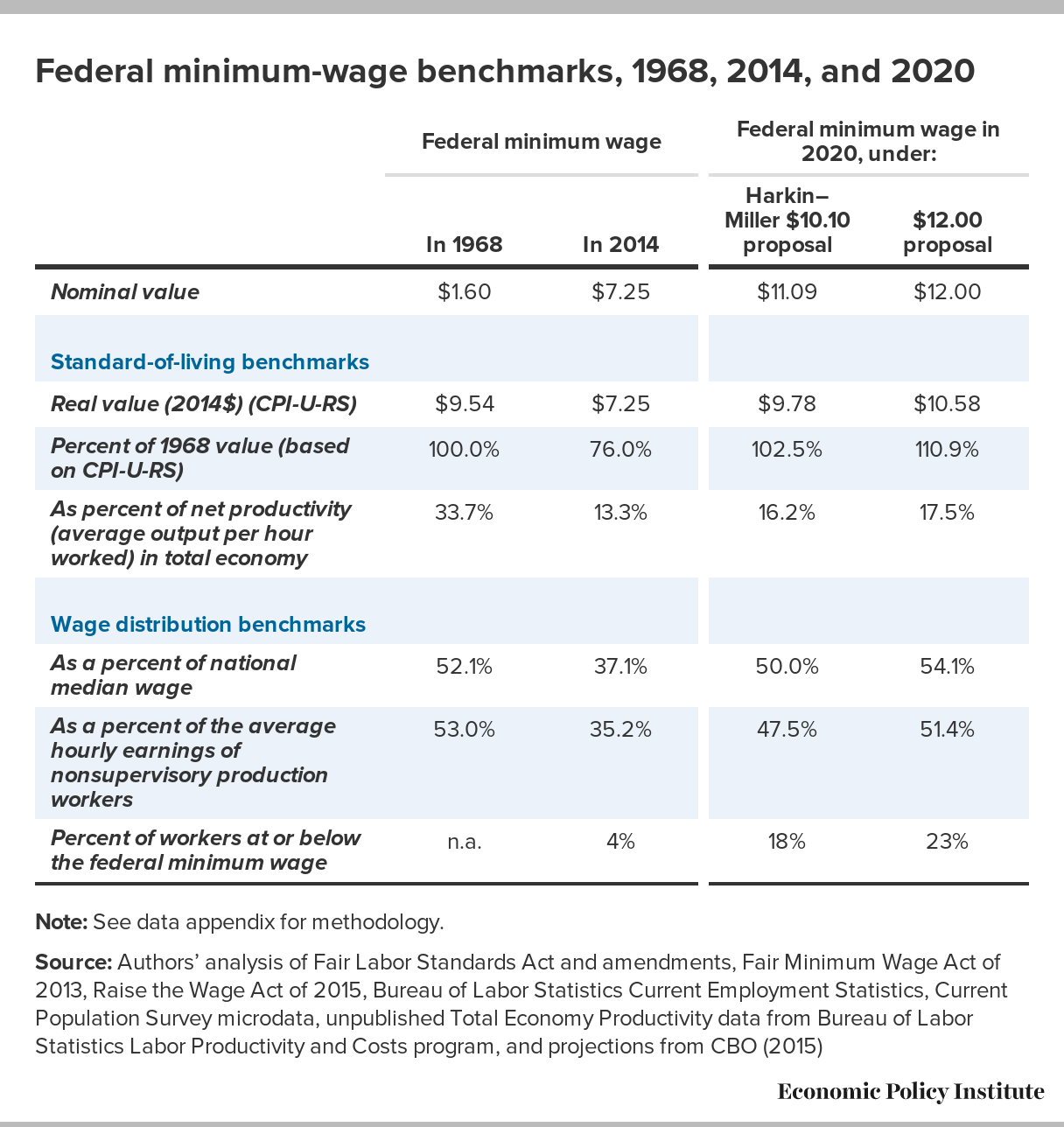 | In 1968 | In 2014 | Harkin–Miller $10.10 proposal | $12.00 proposal | |
