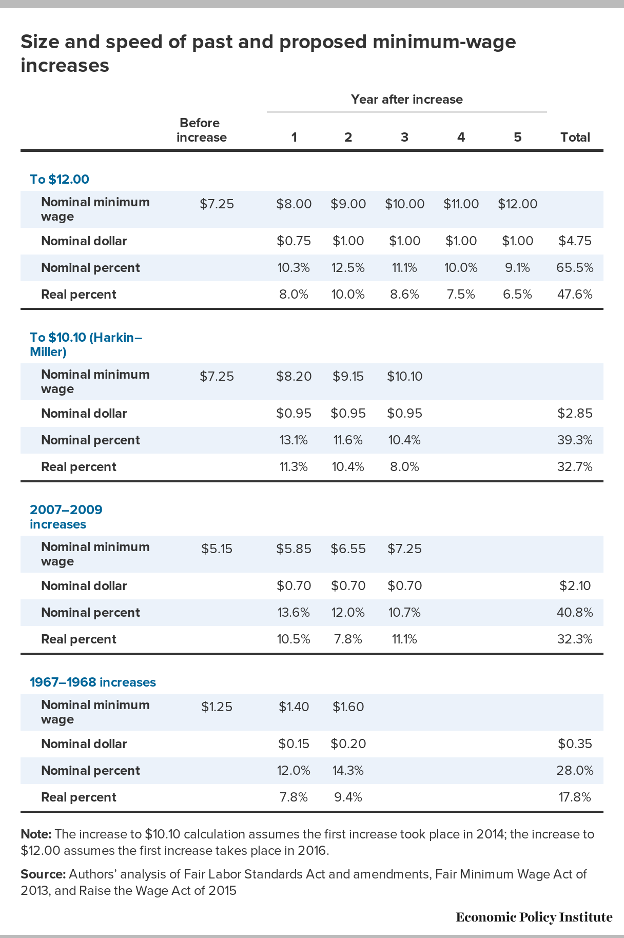 | Nominal minimum wage | $7.25 | $8.00 | $9.00 | $10.00 | $11.00 | $12.00 | |