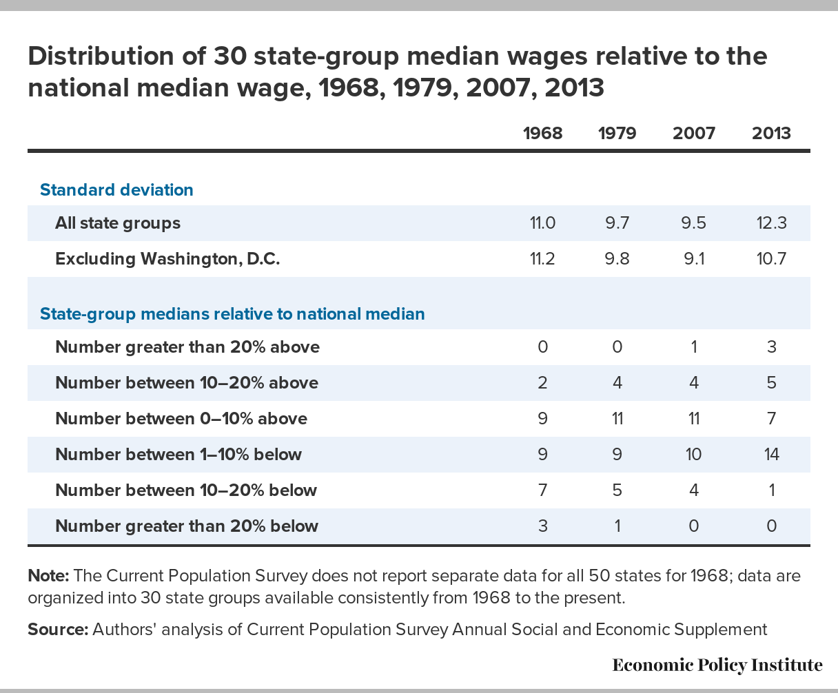 Distribution of 30 state-group median wages relative to the national median wage, 1968, 1979, 2007, 2013