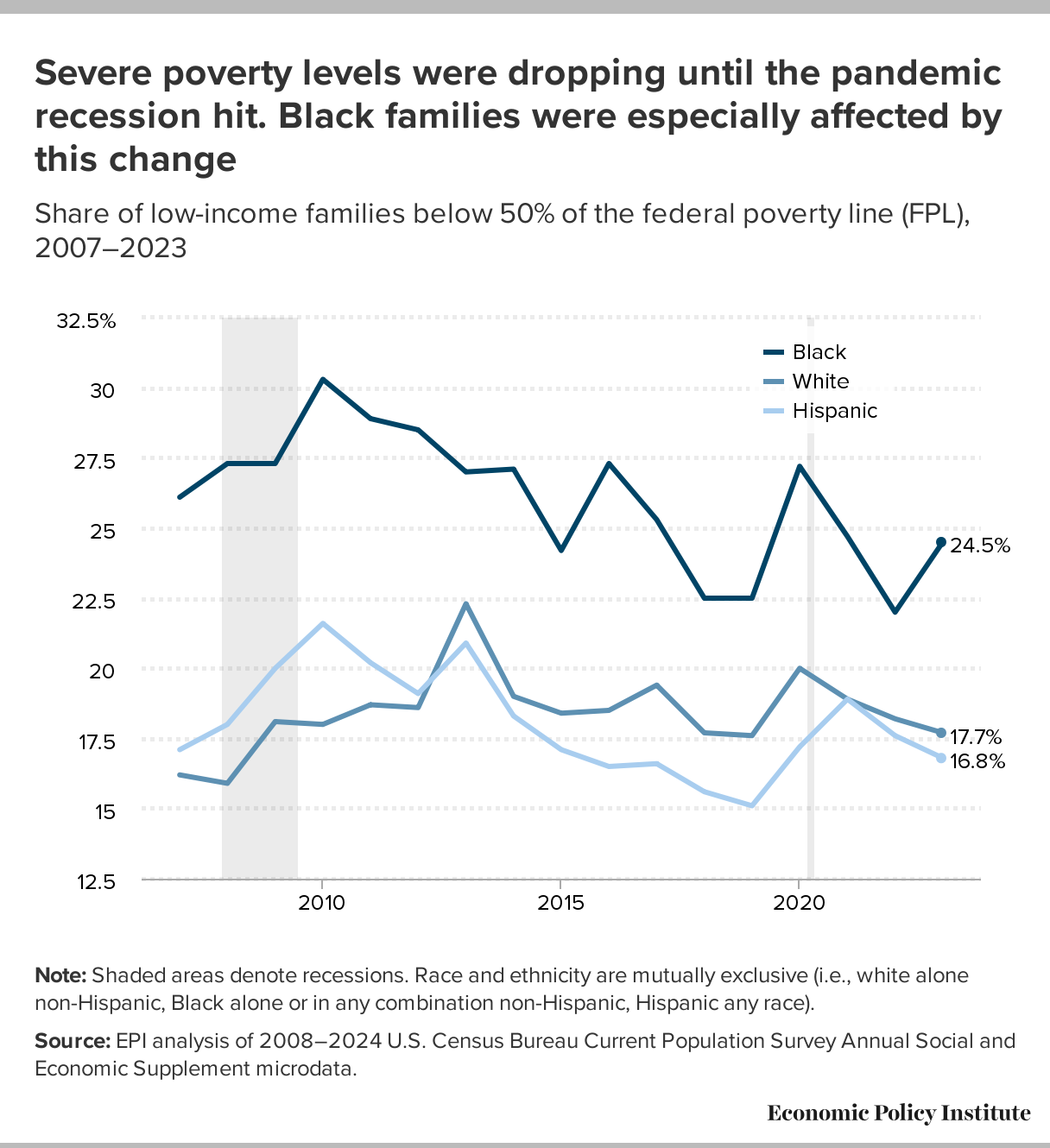 Severe poverty levels were dropping until the pandemic recession hit. Black families were especially affected by this change: Share of low-income families below 50% of the federal poverty line (FPL), 2007–2023