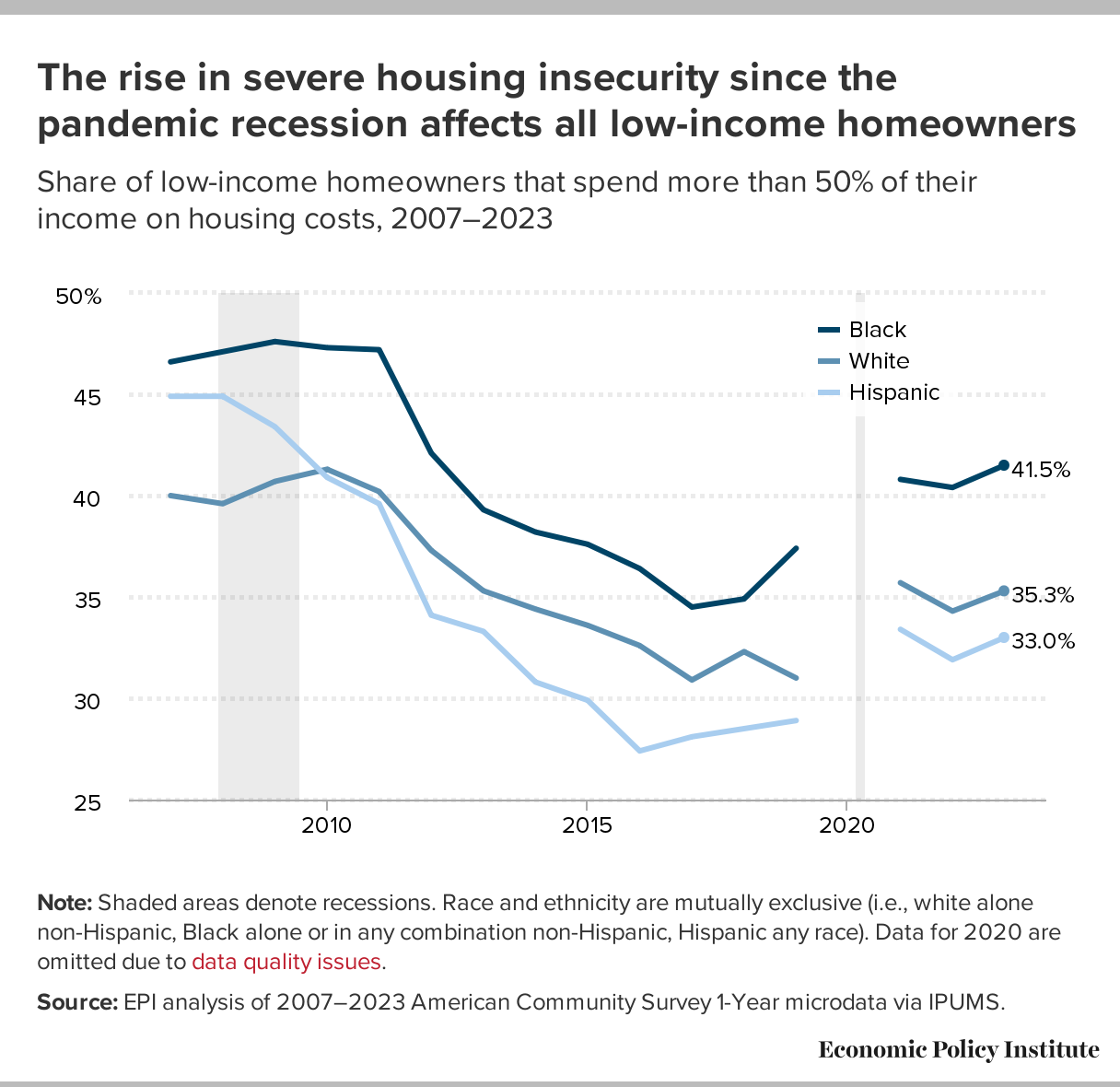 The rise in severe housing insecurity since the pandemic recession affects all low-income homeowners: Share of low-income homeowners that spend more than 50% of their income on housing costs, 2007–2023