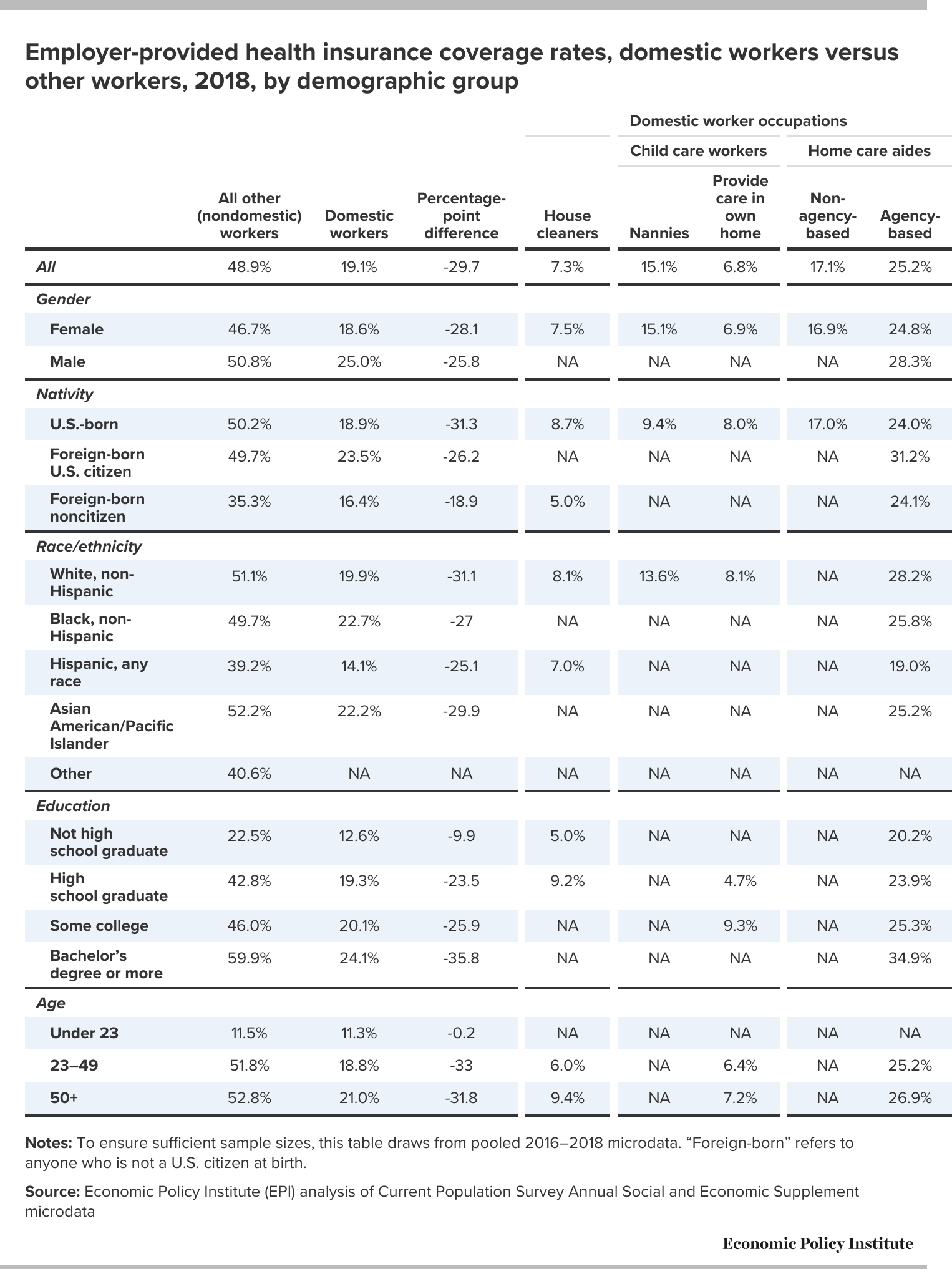 Employer-provided health insurance coverage rates, domestic workers versus other workers, 2018, by demographic group