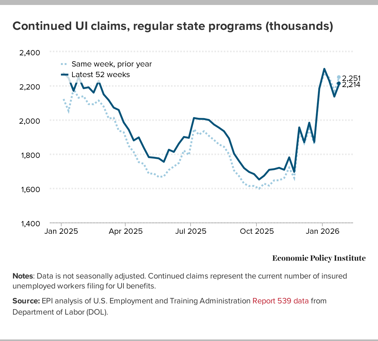 Notes: Data is not seasonally adjusted. Continued claims represent the current number of insured unemployed workers filing for UI benefits.