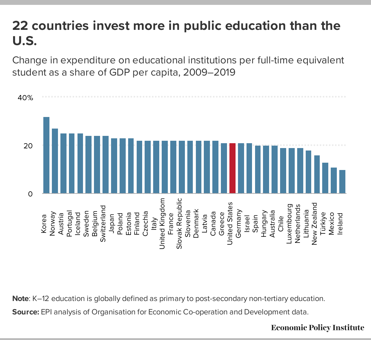 22 countries invest more in public education than the U.S.: Change in expenditure on educational institutions per full-time equivalent student as a share of GDP per capita, 2009–2019