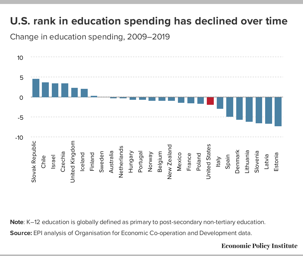 U.S. rank in education spending has declined over time: Change in education spending, 2009–2019