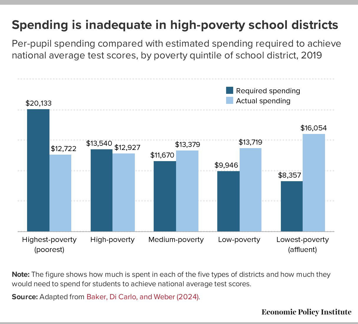 Spending is inadequate in high-poverty school districts: Per-pupil spending compared with estimated spending required to achieve national average test scores, by poverty quintile of school district, 2019