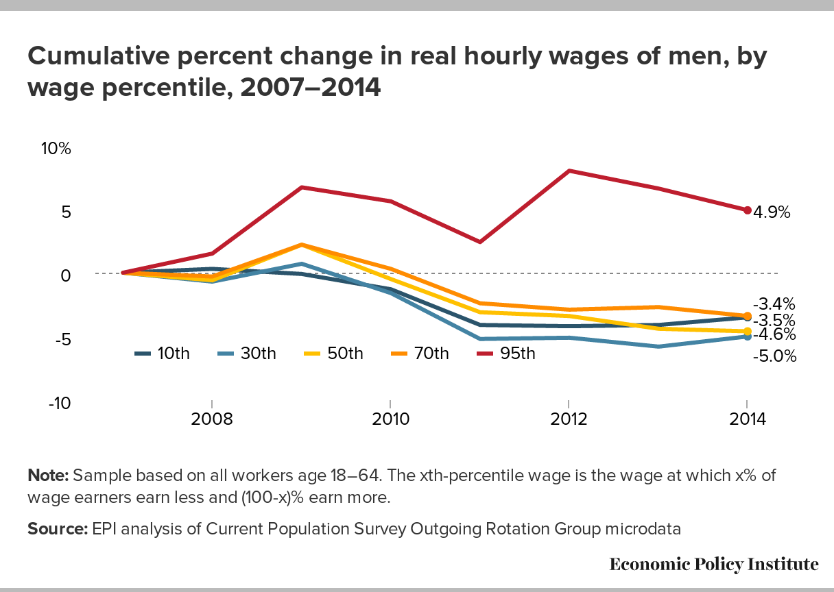 Cumulative percent change in real hourly wages of men, by wage percentile, 2007–2014