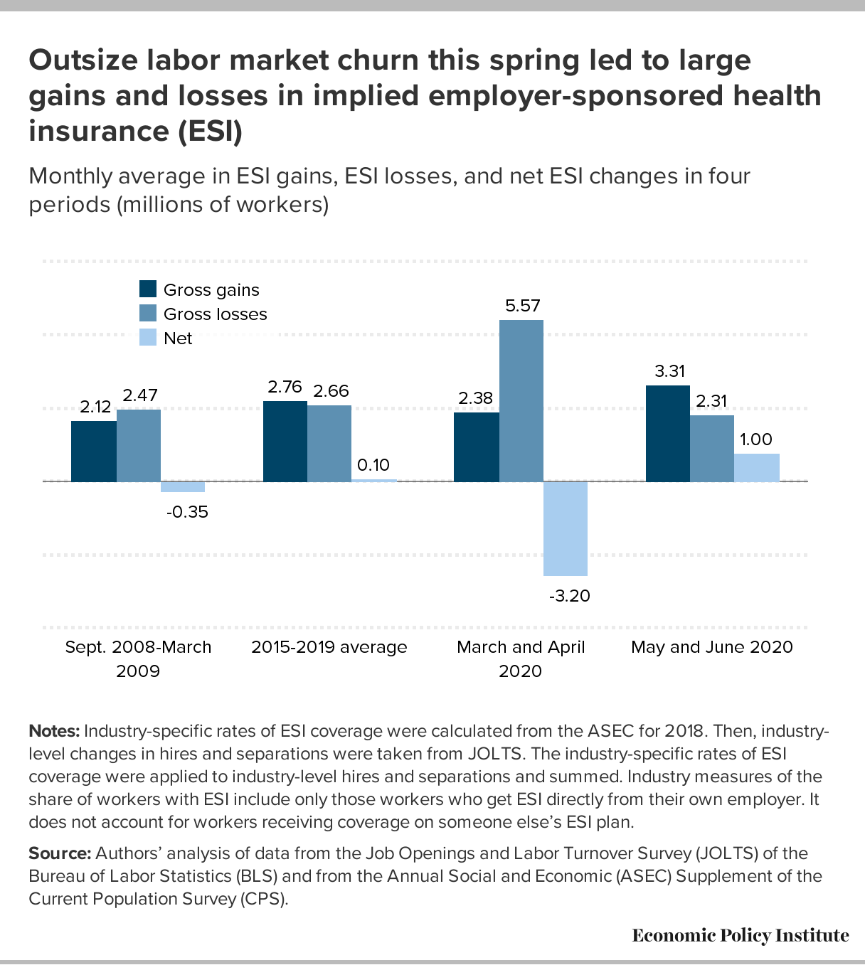Notes: Industry-specific rates of ESI coverage were calculated from the ASEC for 2018. Then, industry-level changes in hires and separations were taken from JOLTS. The industry-specific rates of ESI coverage were applied to industry-level hires and separations and summed. Industry measures of the share of workers with ESI include only those workers who get ESI directly from their own employer. It does not account for workers receiving coverage on someone else’s ESI plan.