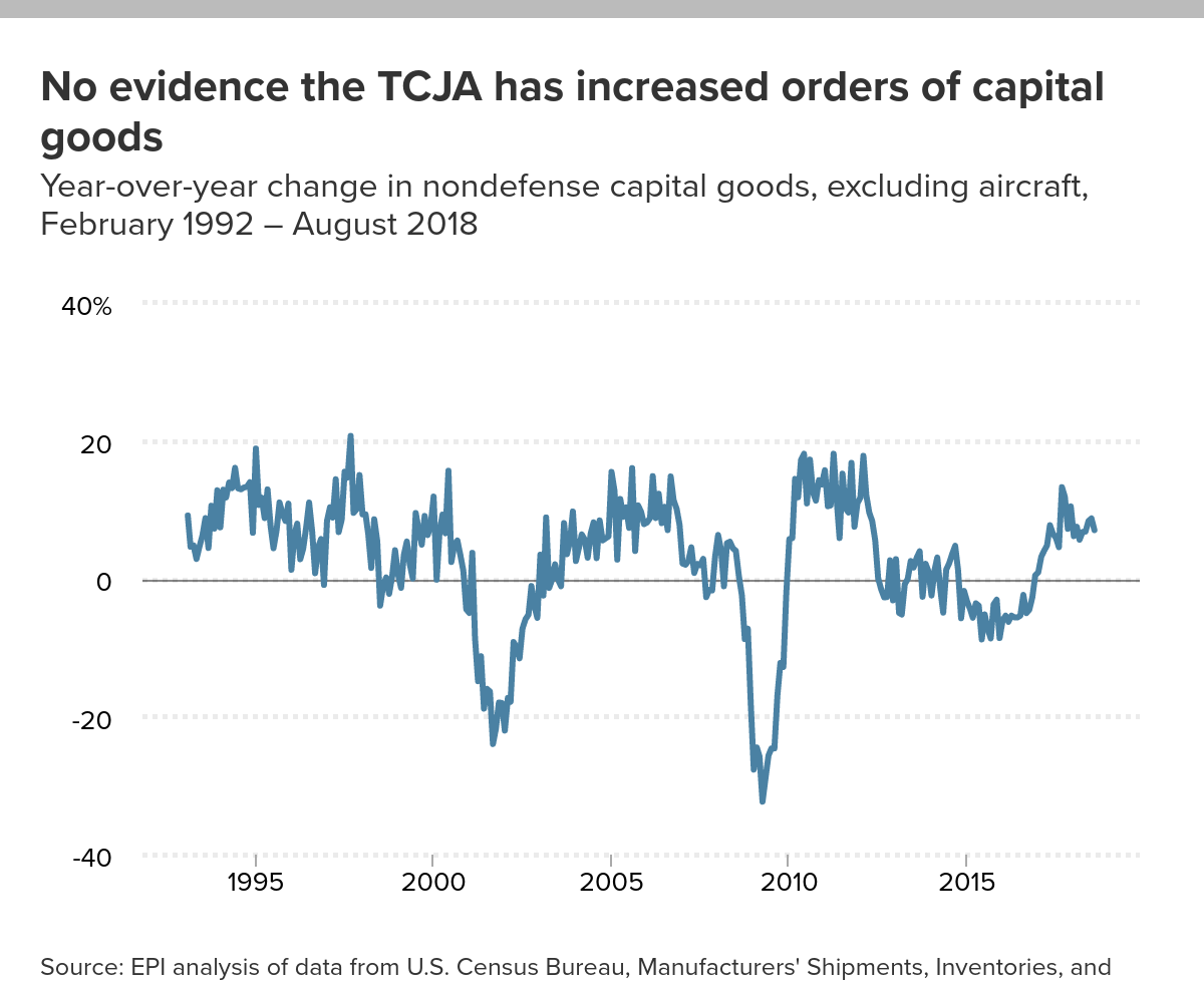 No evidence the TCJA has increased orders of capital goods: Year-over-year change in nondefense capital goods, excluding aircraft, February 1992 - August 2018