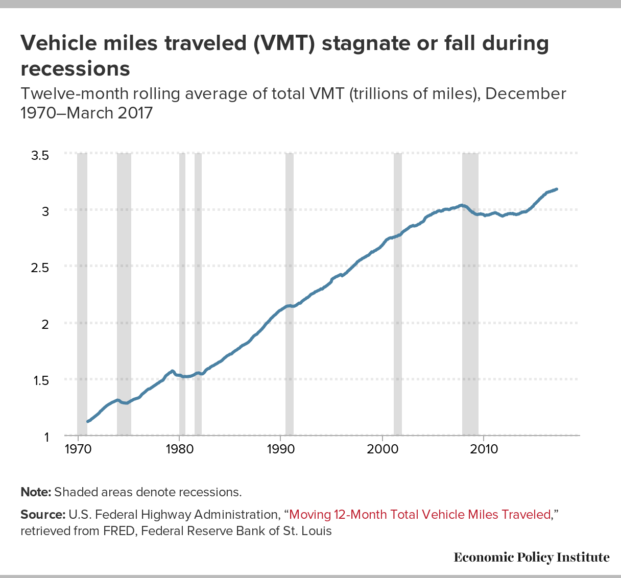 Vehicle miles traveled (VMT) stagnate or fall during recessions: Twelve-month rolling average of total VMT (trillions of miles), December 1970--March 2017