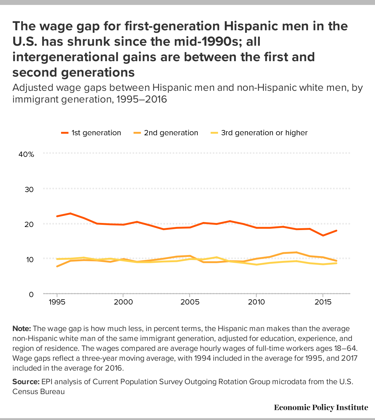 Note: The wage gap is how much less, in percent terms, the Hispanic man makes than the average non-Hispanic white man of the same immigrant generation, adjusted for education, experience, and region of residence. The wages compared are average hourly wages of full-time workers ages 18–64. Wage gaps reflect a three-year moving average, with 1994 included in the average for 1995, and 2017 included in the average for 2016.