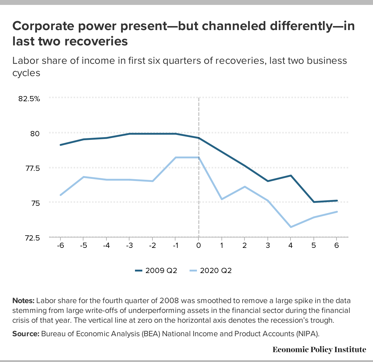 Corporate power present—but channeled differently—in last two recoveries: Labor share of income in first six quarters of recoveries, last two business cycles