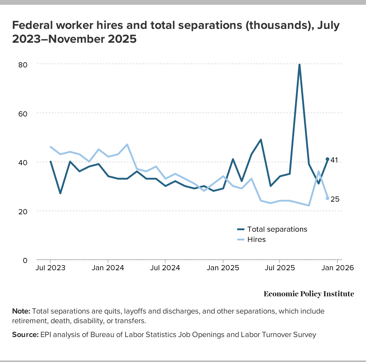 Federal worker hires and total separations (thousands), July 2023–November 2025