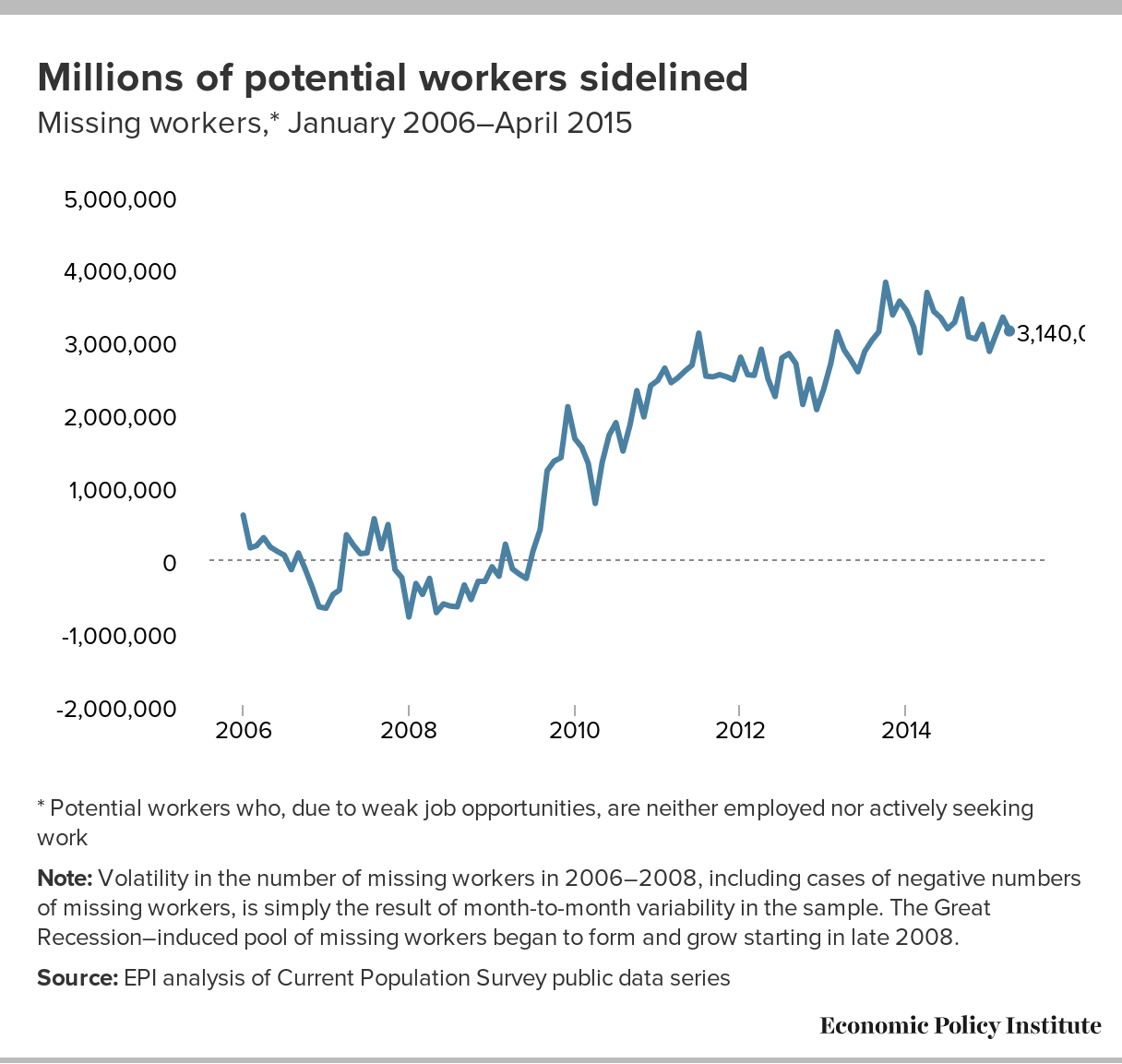 Millions of potential workers sidelined: Missing workers,* January 2006–April 2015