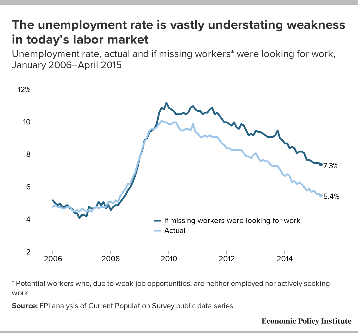 The unemployment rate is vastly understating weakness in today's labor market: Unemployment rate, actual and if missing workers* were looking for work, January 2006–April 2015