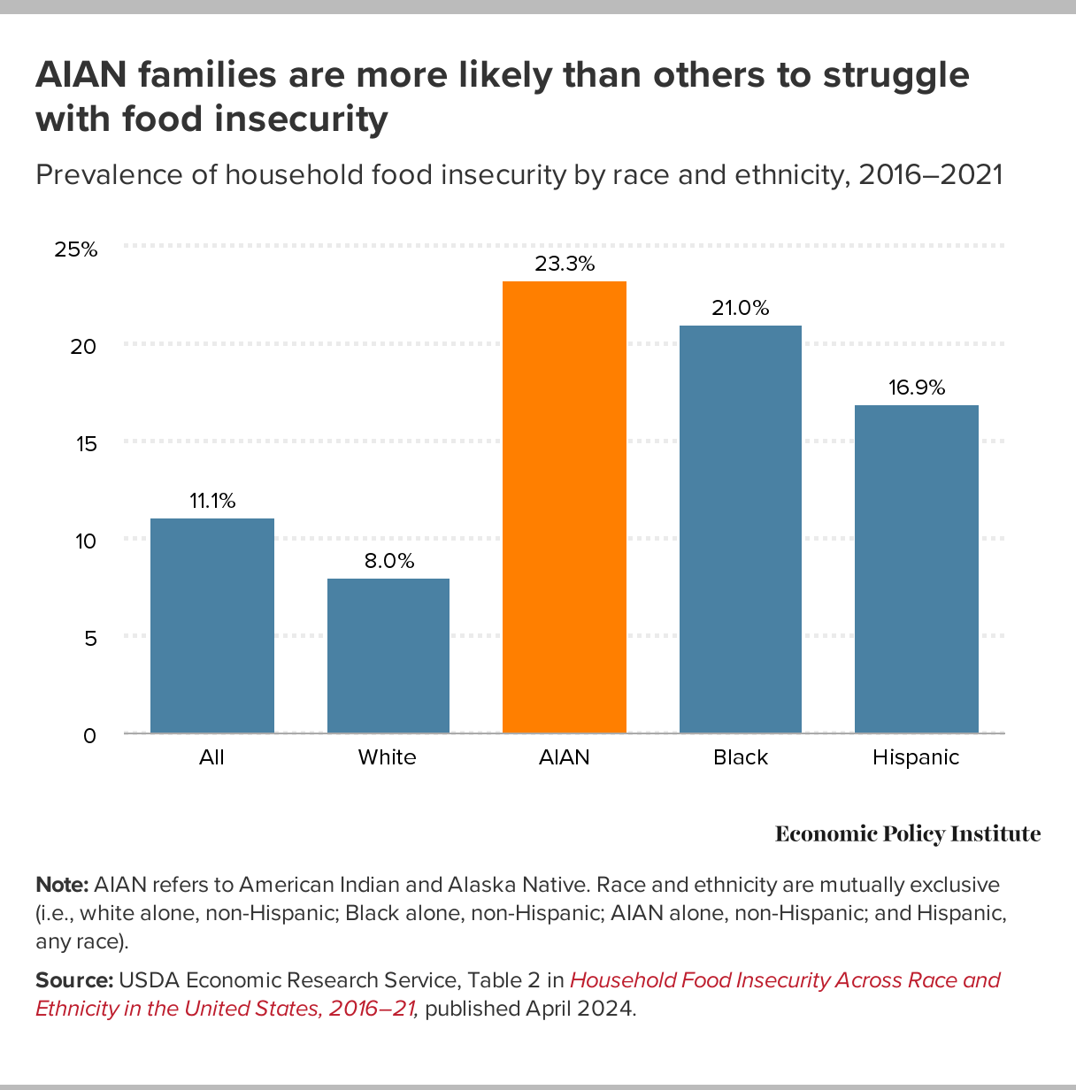 Source: USDA Economic Research Service, Table 2 in Household Food Insecurity Across Race and Ethnicity in the United States, 2016–21, published April 2024.