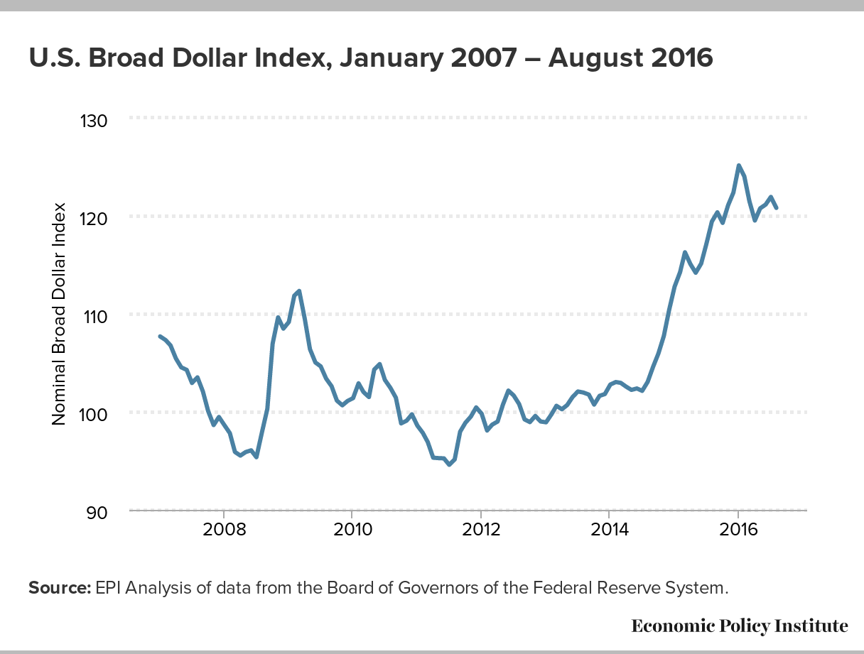 U.S. Broad Dollar Index, January 2007 – August 2016