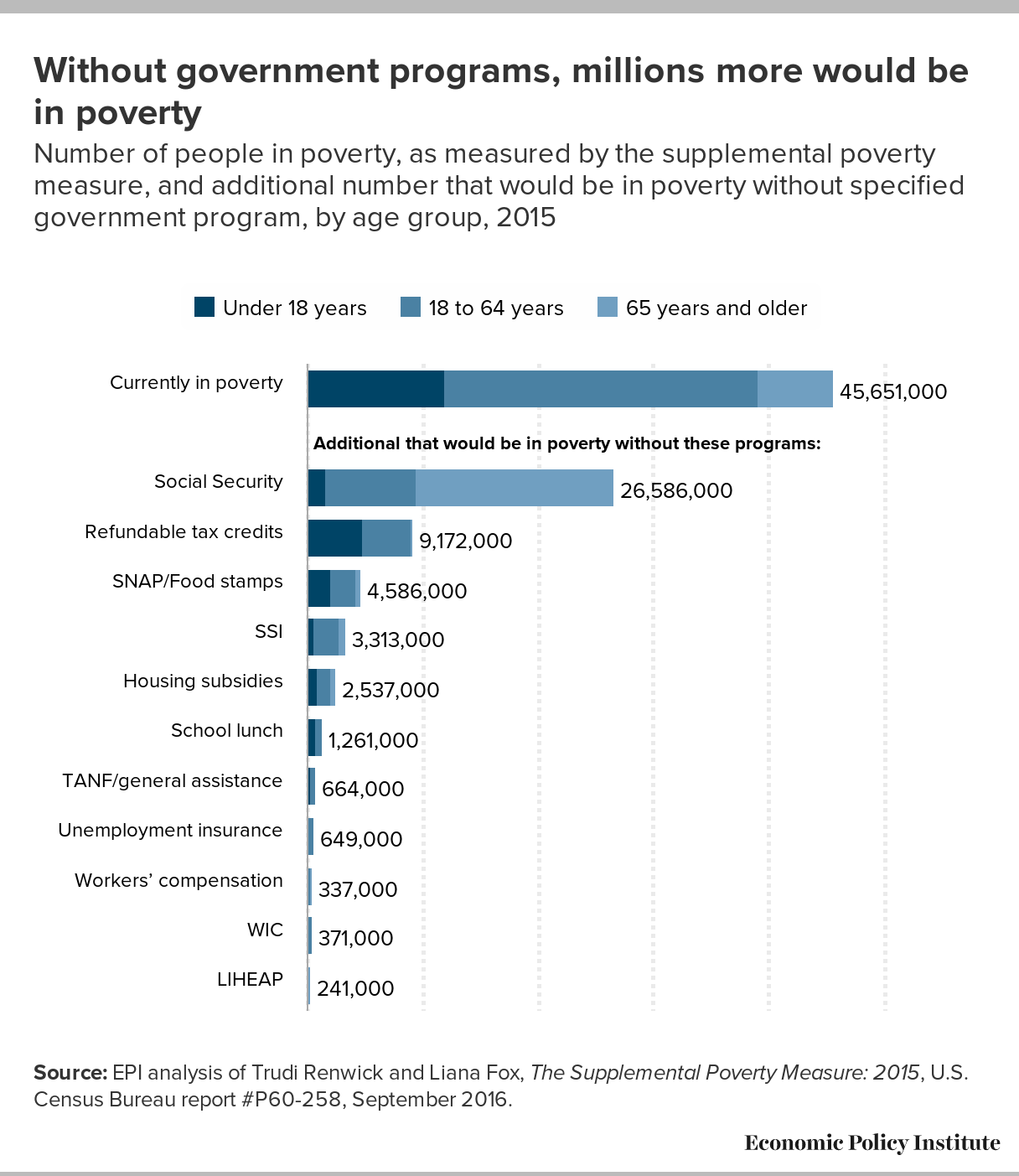 Without government programs, millions more would be in poverty: Number of people in poverty, as measured by the supplemental poverty measure, and additional number that would be in poverty without specified government program, by age group, 2015