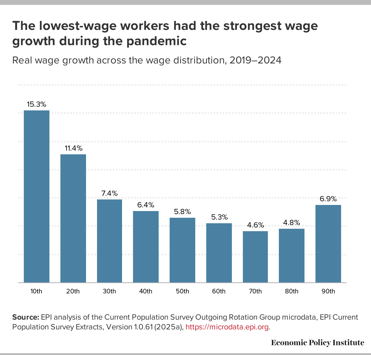 The lowest-wage workers had the strongest wage growth during the pandemic: Real wage growth across the wage distribution, 2019–2024