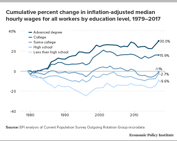 Cumulative percent change in inflation-adjusted median hourly wages for all workers by education level, 1979–2017