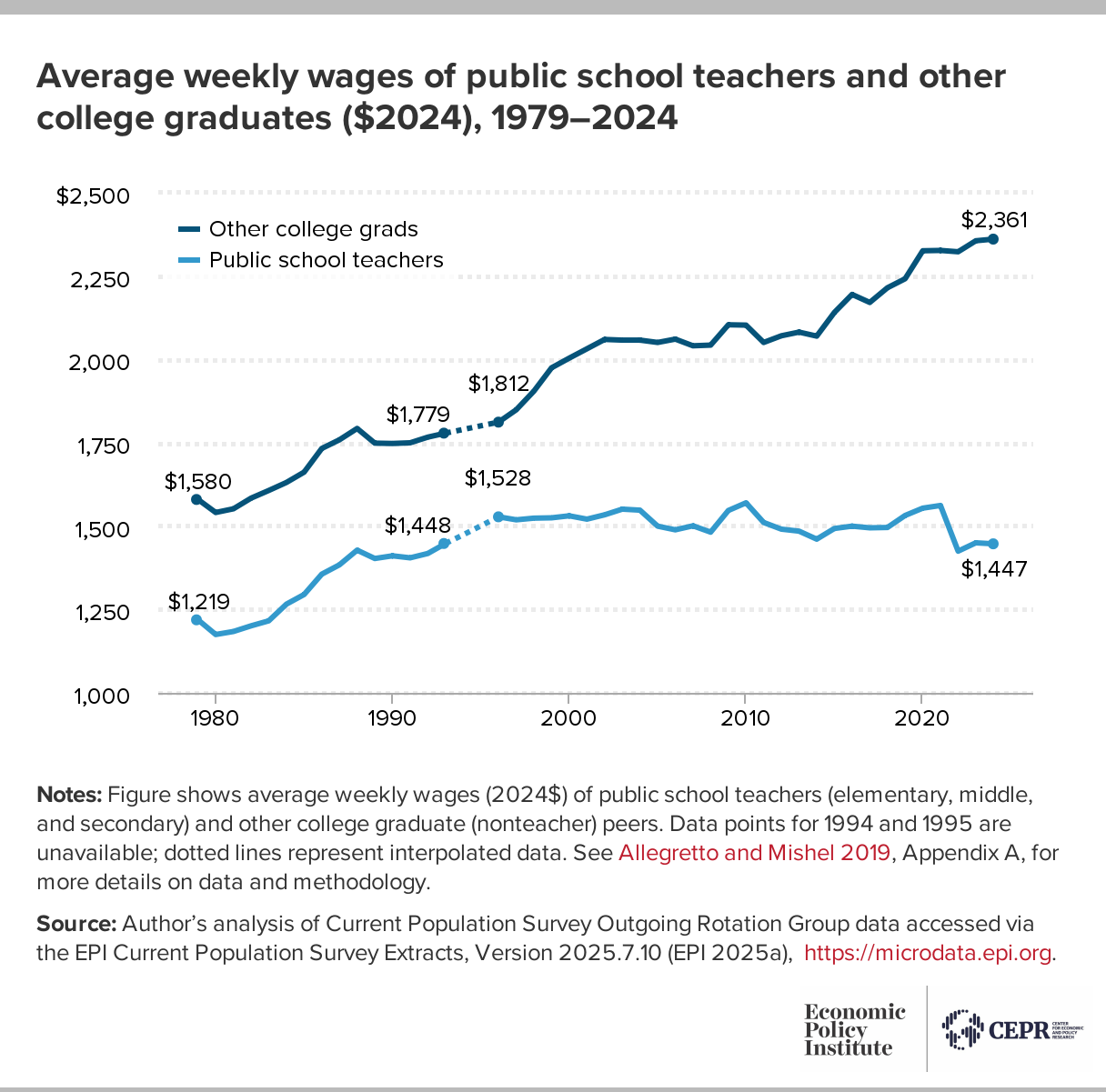 Average weekly wages of public school teachers and other college graduates ($2024), 1979–2024