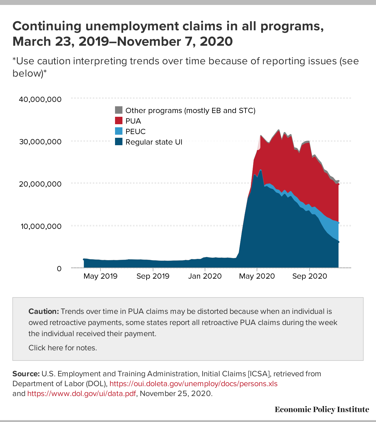 Continuing unemployment claims in all programs, March 23, 2019–November 7, 2020: *Use caution interpreting trends over time because of reporting issues (see below)*