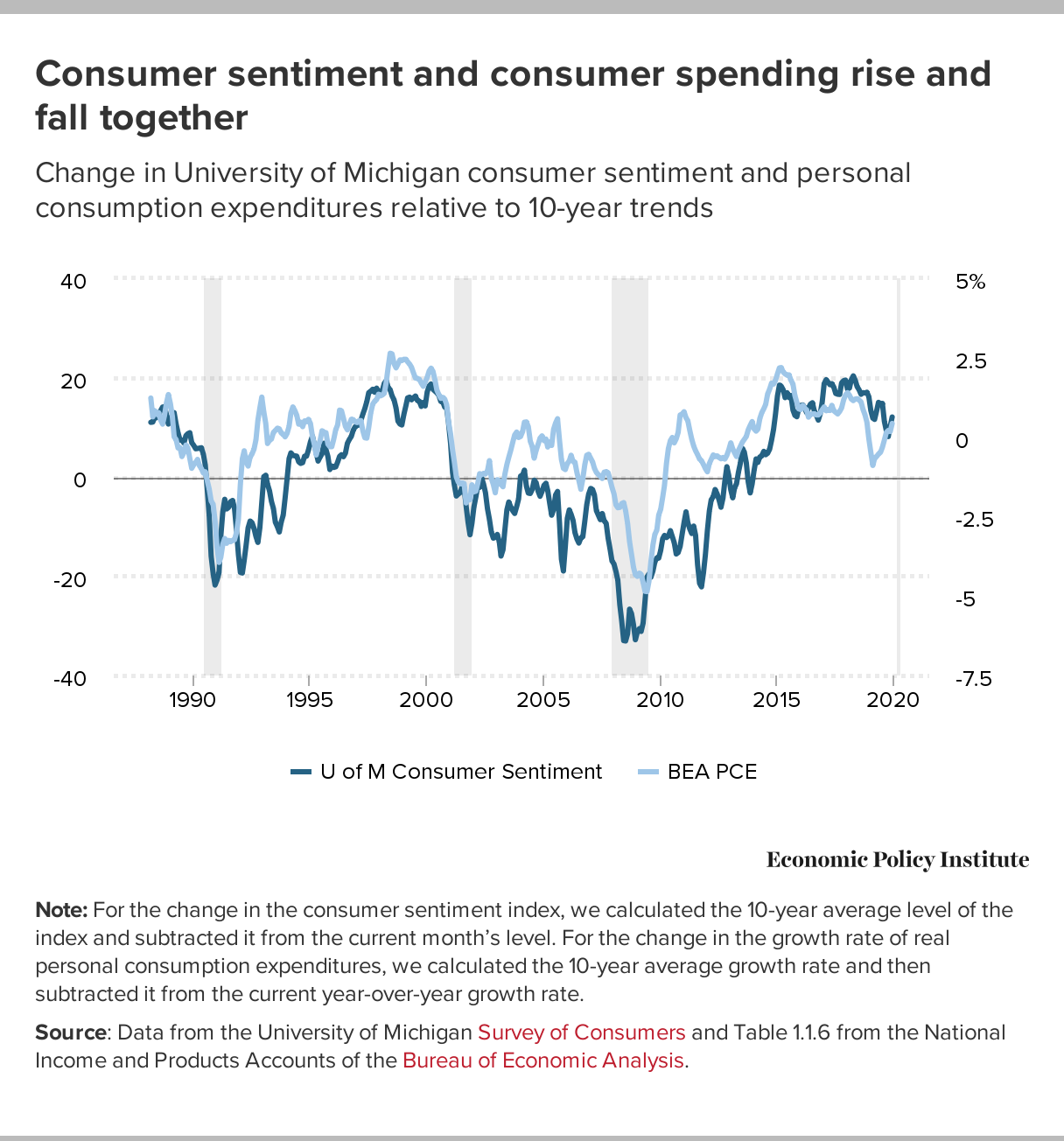 Consumer sentiment and consumer spending rise and fall together: Change in University of Michigan consumer sentiment and personal consumption expenditures relative to 10-year trends