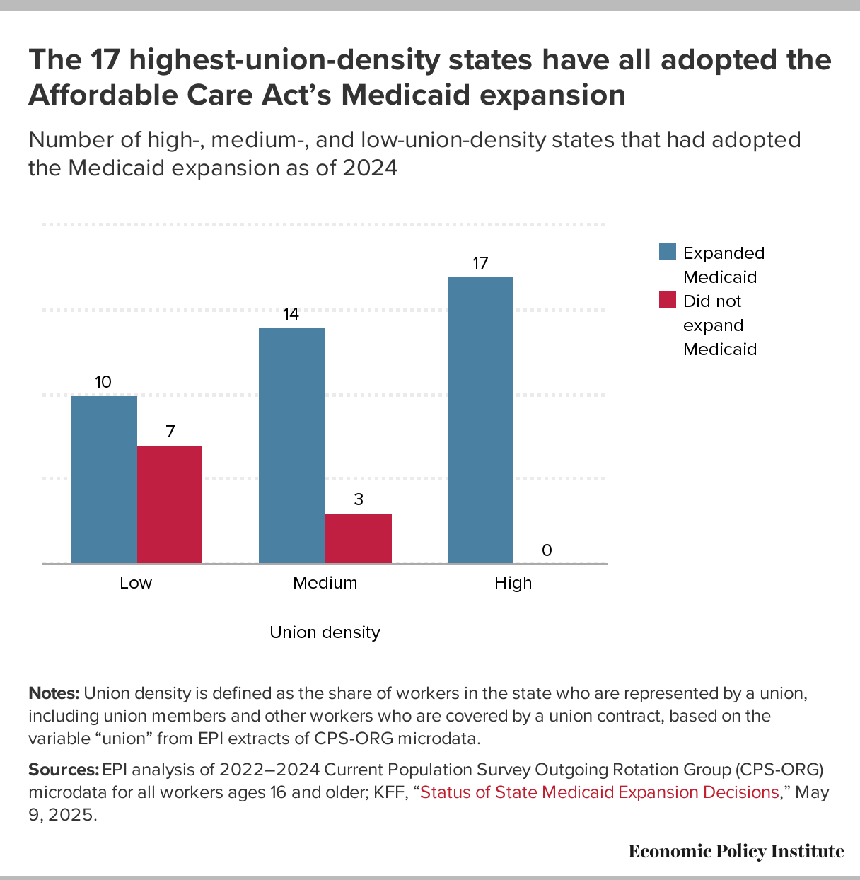 Sources: EPI analysis of 2022–2024 Current Population Survey Outgoing Rotation Group (CPS-ORG) microdata for all workers ages 16 and older; KFF, “Status of State Medicaid Expansion Decisions,” May 9, 2025.