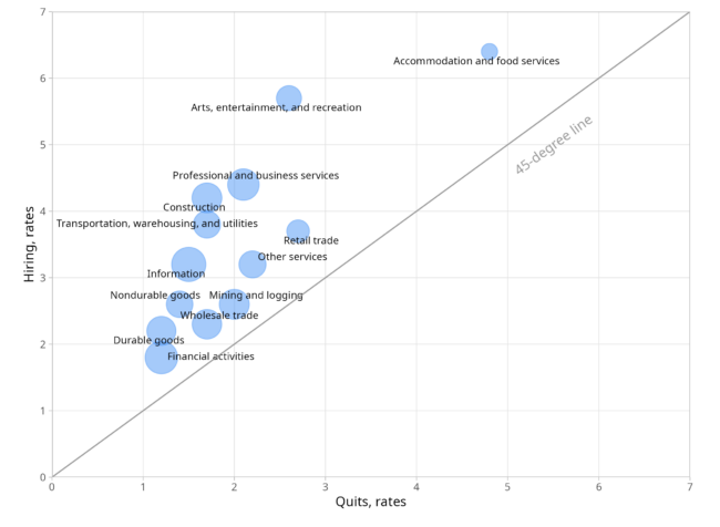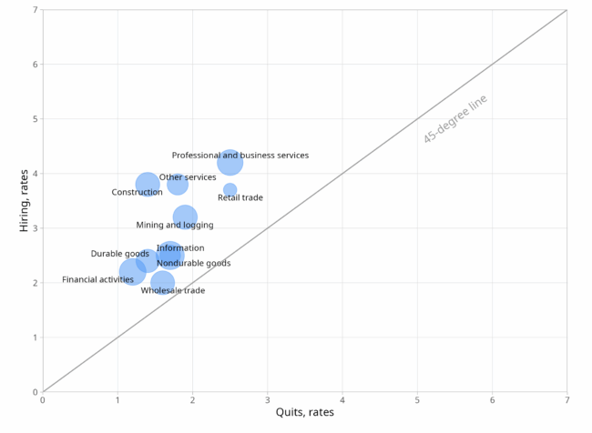 The Job Openings and Labor Turnover Survey (JOLTS) tells us how many job openings there are each month, how many workers were hired, how many quit their job, how many were laid off, and how many experienced other separations (which includes worker deaths).