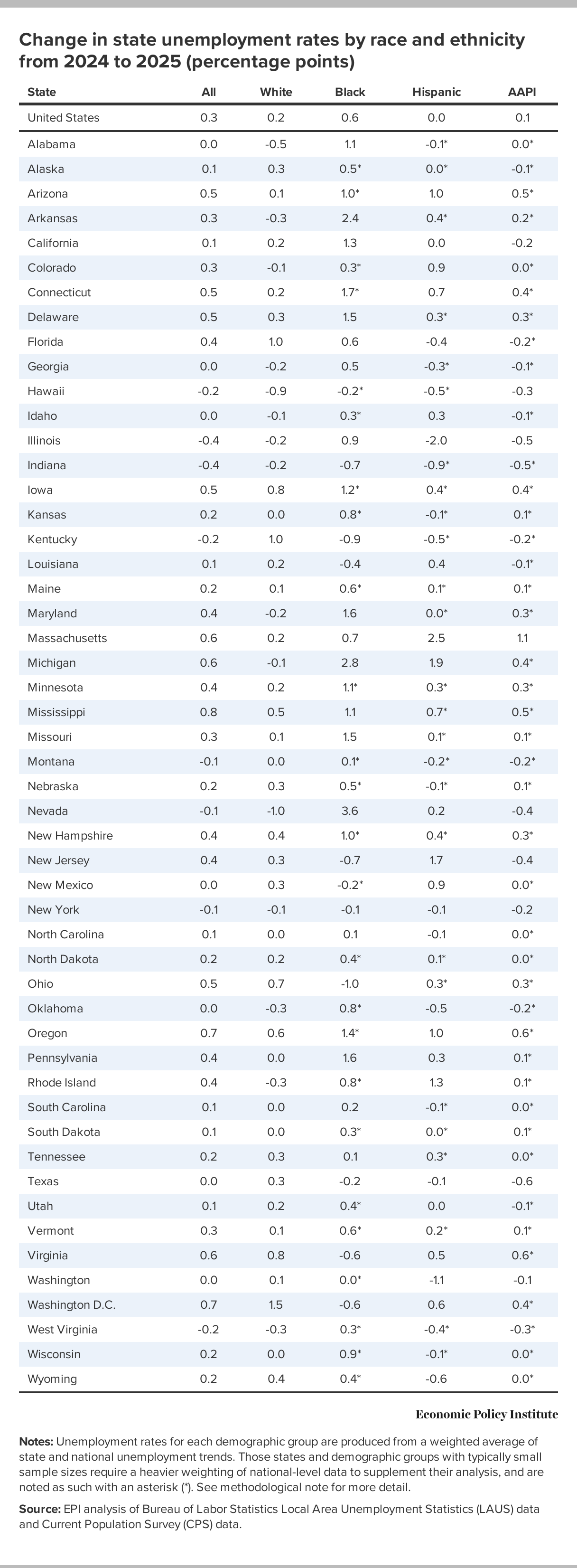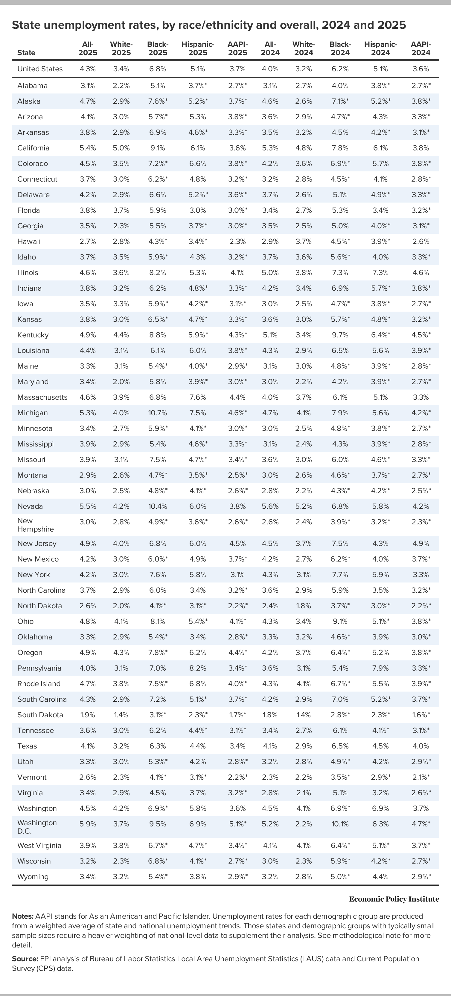 We report estimates for all states and subgroups, flagging those for which constructed unemployment rates are heavily weighted by national-level data with an asterisk (*) (see methodological note). The following analysis contains data on the average unemployment rates across groups for the entire year of 2025, not the fourth quarter of 2025 as typical EPI reports have covered in the past.