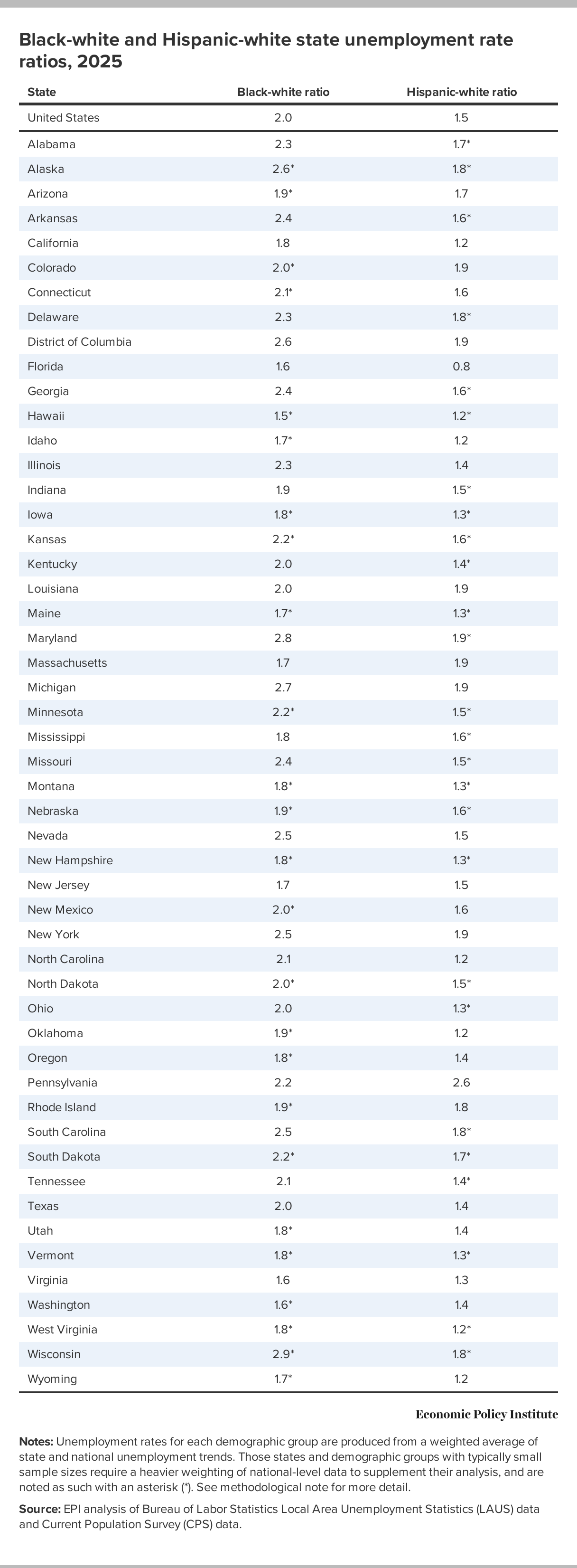 Black-white and Hispanic-white state unemployment rate ratios, 2025