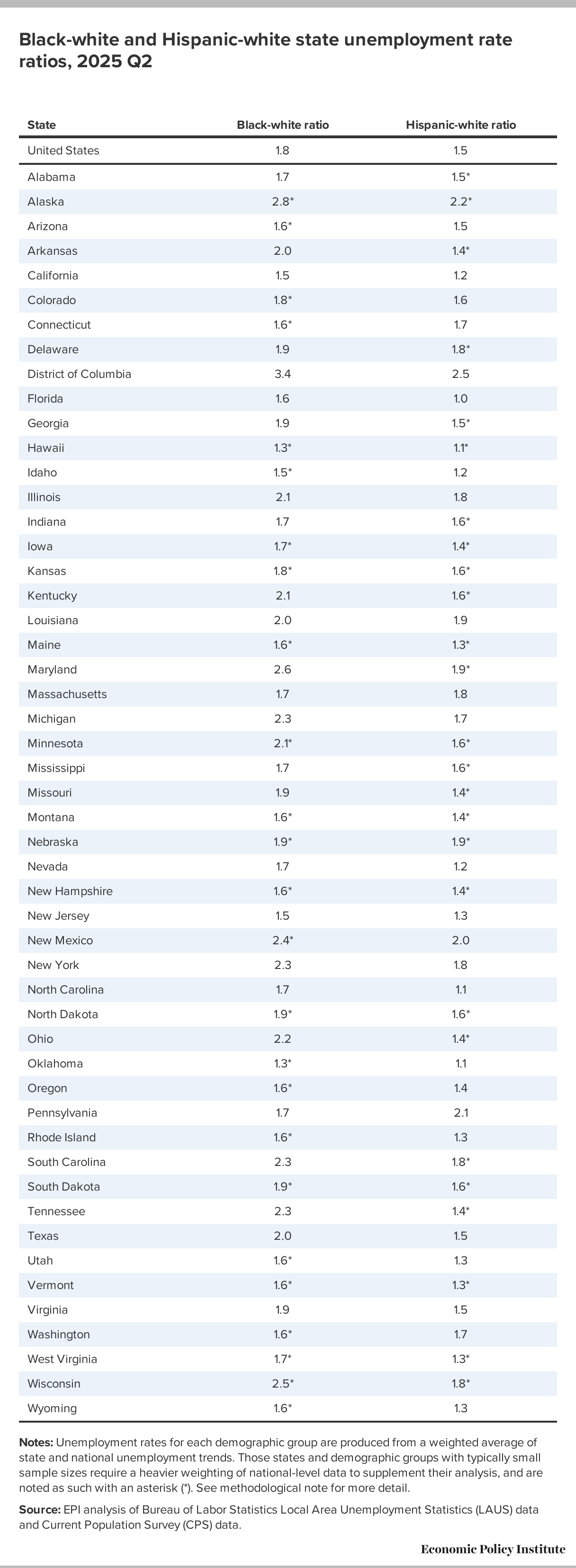 The national Black-white unemployment ratio for 2025 Q2 fell to 1.8-to-1, from 1.9-to-1 in the previous quarter. Washington, D.C.’s Black-white unemployment ratio continues to fall, to 3.4-to-1 from 3.9-to-1 in the previous quarter—the lowest point for the District of Columbia in this series thus far, though still the highest Black-white ratio in the nation. This is, once again, due to an increasing white unemployment rate in Washington, D.C., likely the result of reductions in the federal workforce. California and New Jersey had the lowest Black-white unemployment ratios among states with large enough Black worker populations for precise estimates at 1.5-to-1. Hawaii and Oklahoma had the lowest Black-white unemployment ratios among all states, at 1.3-to-1, but have relatively small Black worker sample sizes. There were no states where Black and white workers are equally likely to be unemployed.