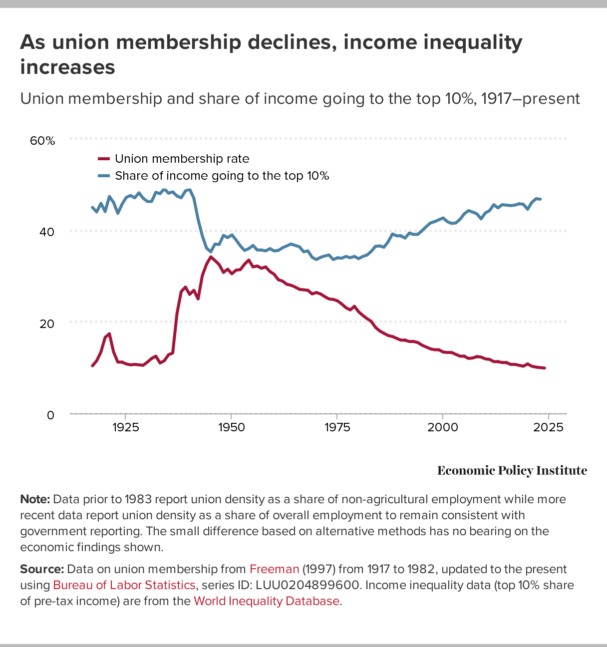 In a period of rising inequality (Gould and Kandra 2024; Bivens et al. 2024) and record corporate profits (Bivens 2023), it is no surprise workers want unions. When workers are able to collectively bargain, their wages, benefits, and working conditions improve (Bivens et al. 2017). On average, a worker covered by a union contract earns 10.2% more than a nonunionized peer in the same sector with similar education, occupation, and experience and has greater access to paid sick and vacation days, health insurance, and retirement benefits (Banerjee et al. 2021).