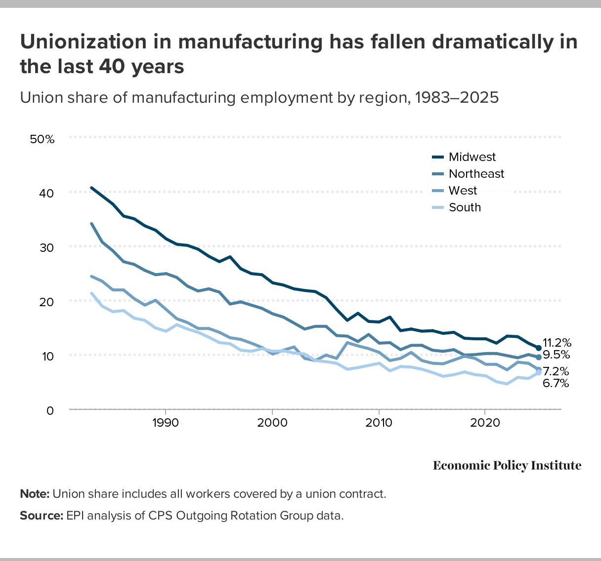 Unionization in manufacturing has fallen dramatically in the last 40 years: Union share of manufacturing employment by region, 1983–2025