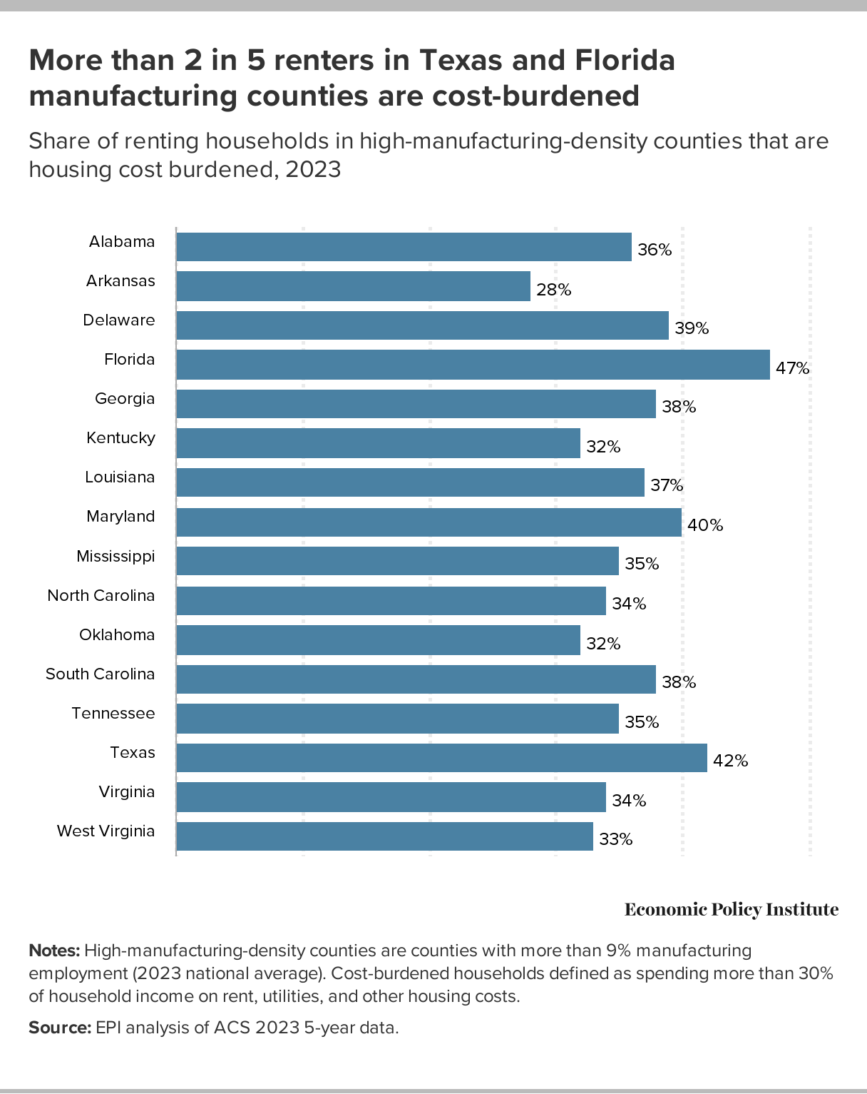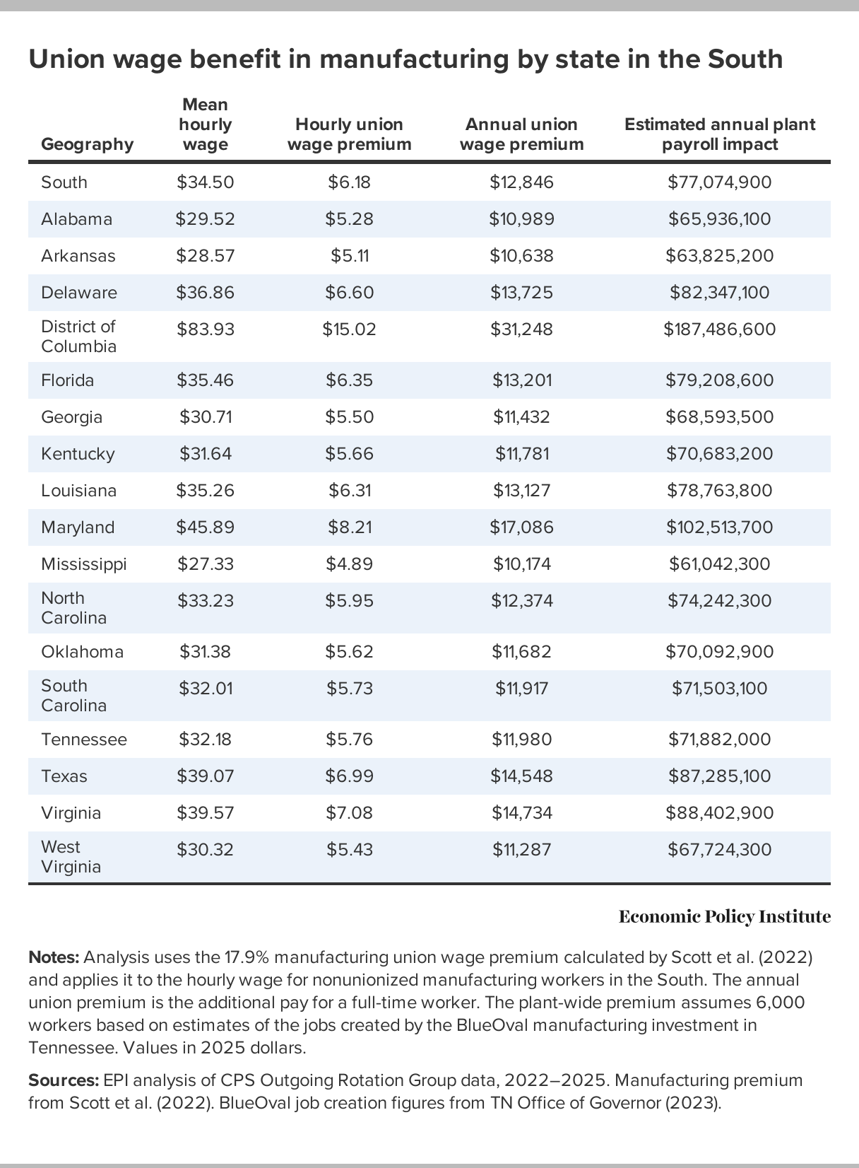Conservative Southern policymakers have long been hostile to union organizing. For example, every Southern state except Maryland and Delaware has passed anti-union so-called right-to-work (RTW) laws, which make it harder for workers to form, join, and sustain unions. Southern states like Florida and Arkansas were among the first to pass such laws in the 1940s, amid a wave of big business backlash against new federal labor laws and white supremacist campaigns to maintain racial hierarchies and suppress multiracial worker organizing. RTW laws suppress unionization rates and, as a result, have driven down wages for both union and nonunion workers alike across the South (Sherer and Gould 2025; Childers 2023).